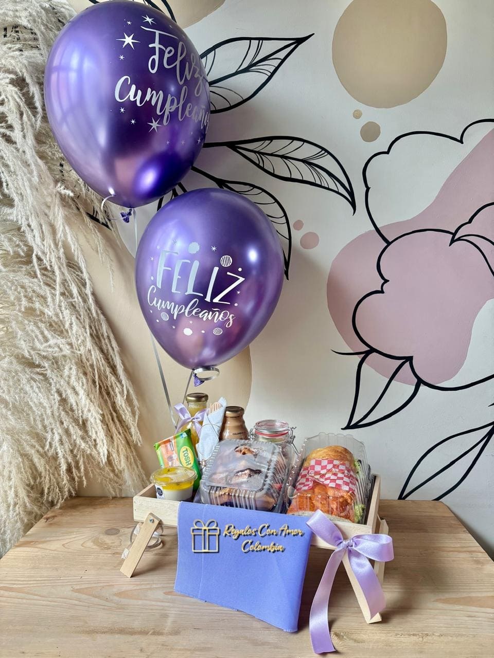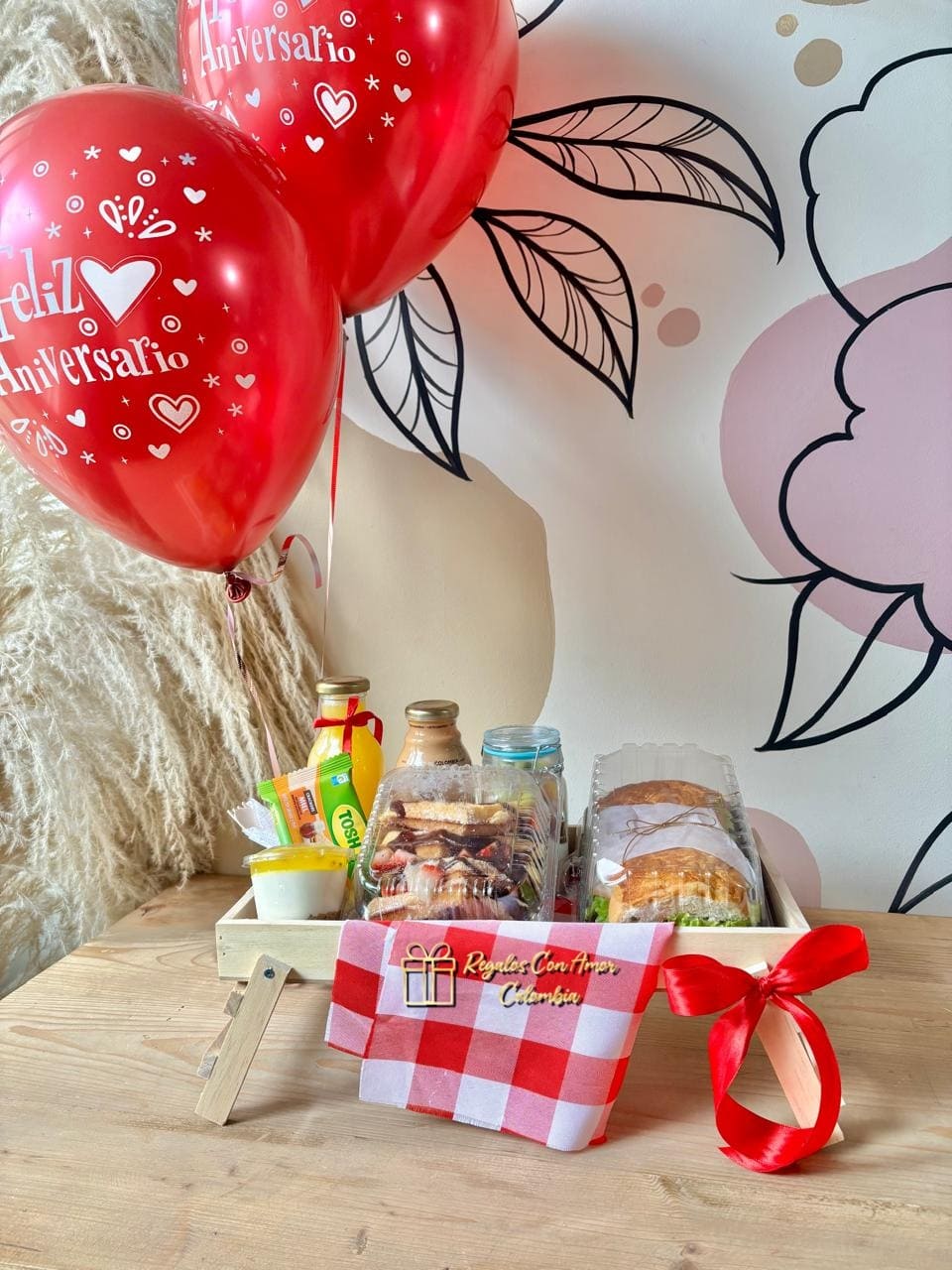 wafles decorados con fresa y arándanos, sándwich baguette con jamón de pavo queso tipo mozarella y lechuga, Parfait: Yogurt Griego: Granola Arándanos Y Trozos De Kiwi En Frasco De Vidrio Con Tapa, cheesecake (tarta de frutas), jugo natural de naranja, cafe latte samsara galletas tosh, servilleta y cubiertos, mesa en madera con mantel y moño en cinta de tela, globos en lates con helio duración 8 horas, Tarjeta dedicatoria con el mensaje que desees, Envoltura de la bandeja con papel celofán decorativo.
