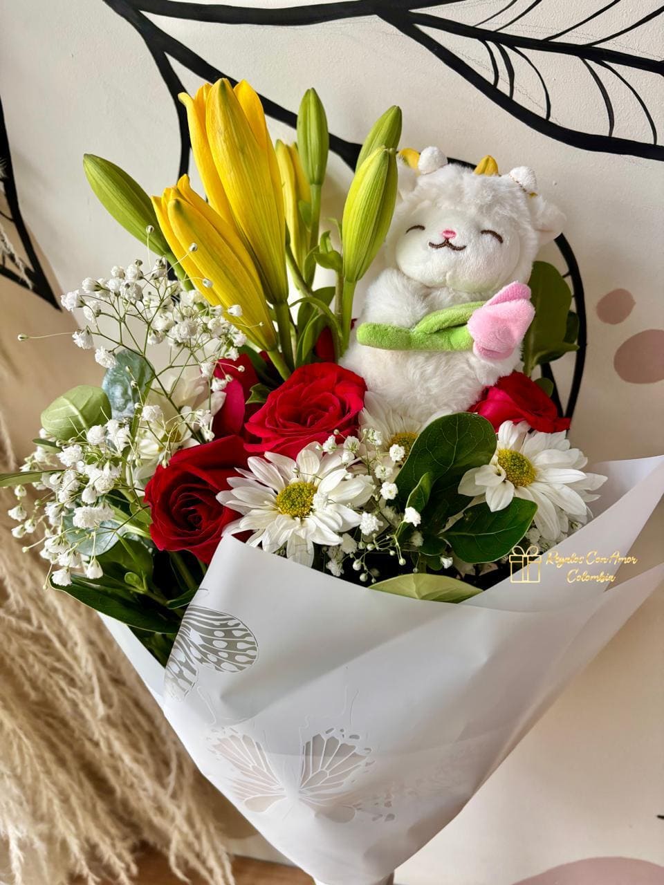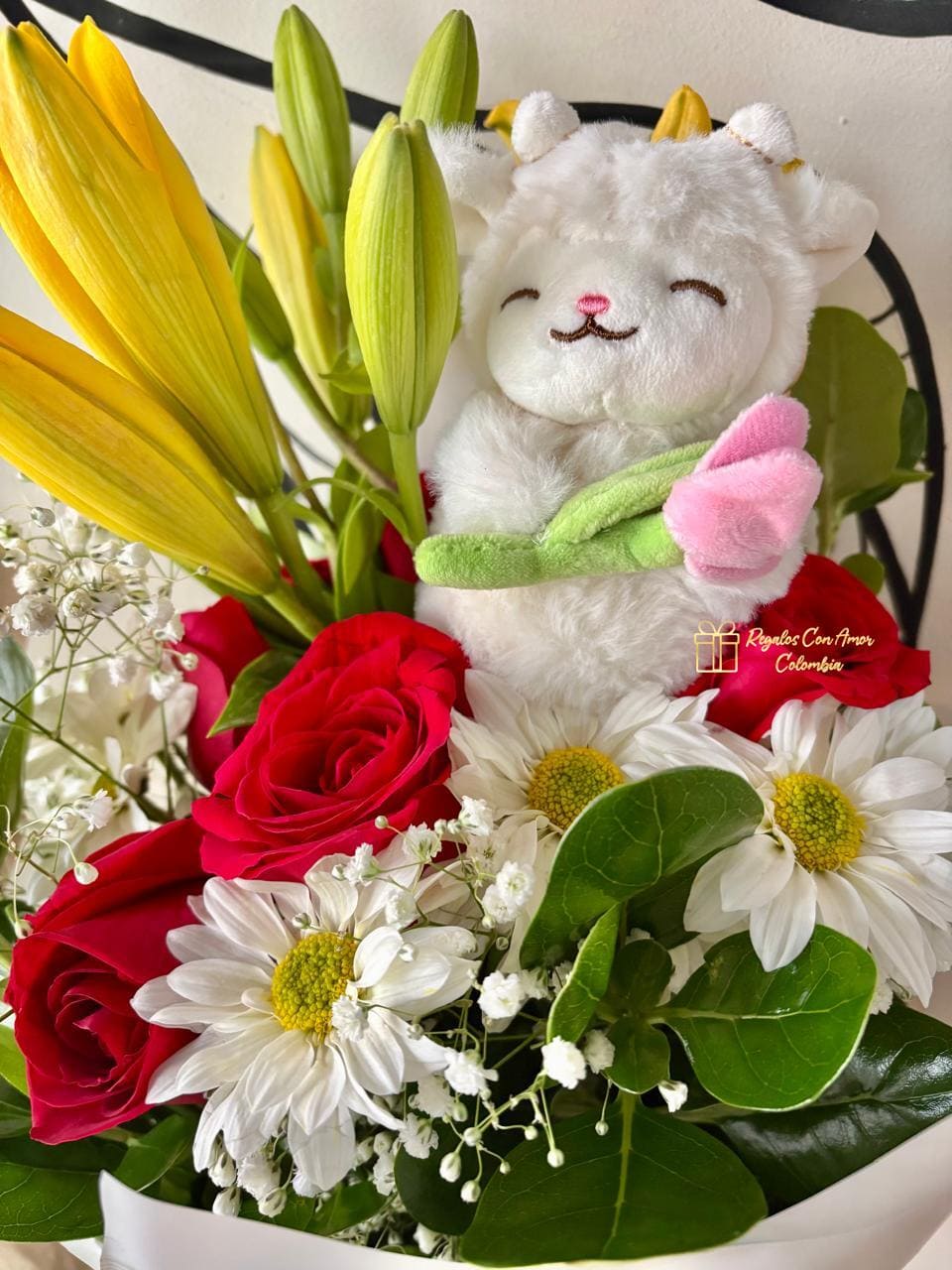 Bouquet de media docena de rosas rojas, margaritas blancas, lirios y follaje decorado con papel coreano y moño en cinta de tela, peluche corderito llavero 10cm, tarjeta dedicatoria con el mensaje que nos envíes.