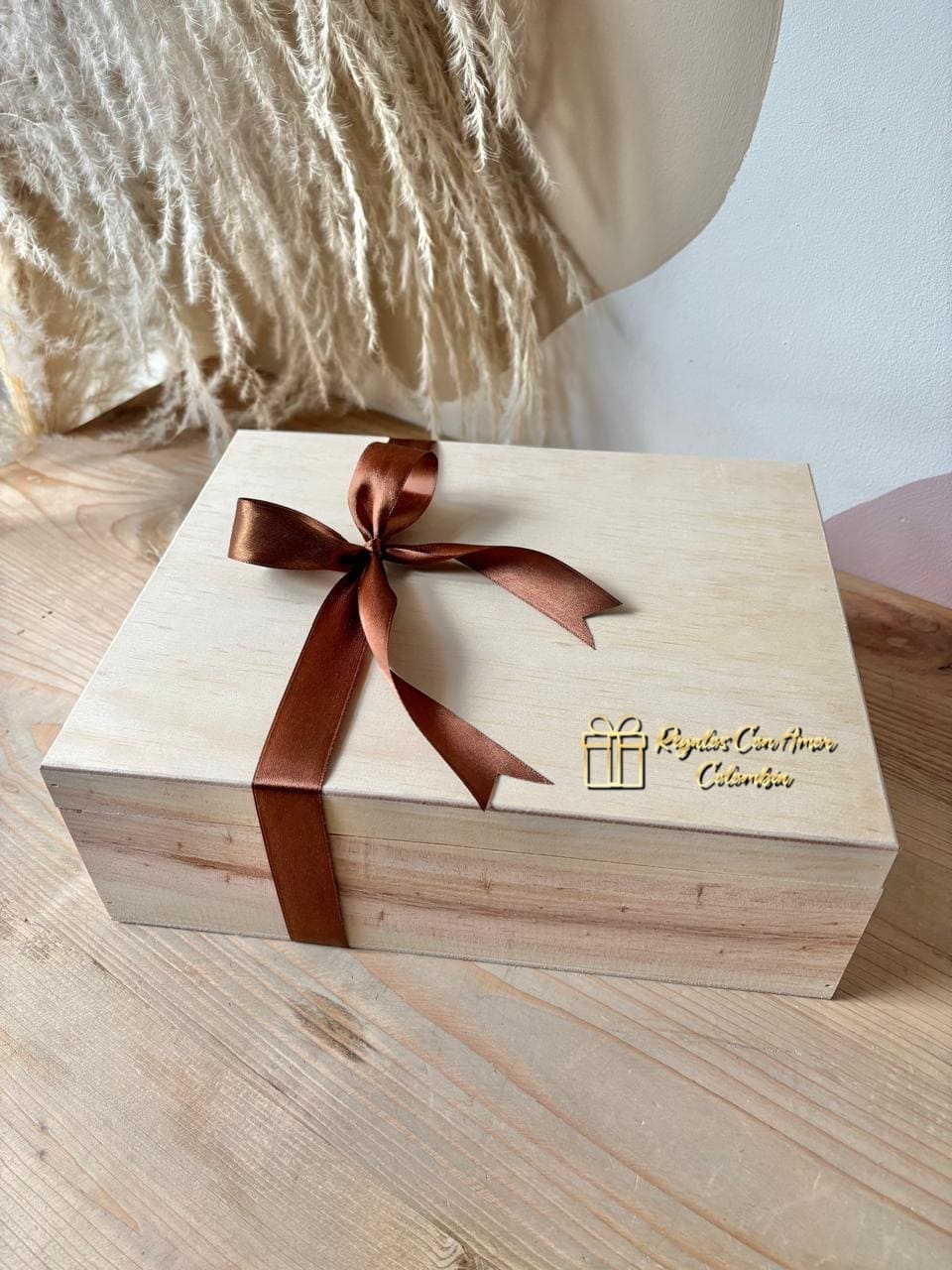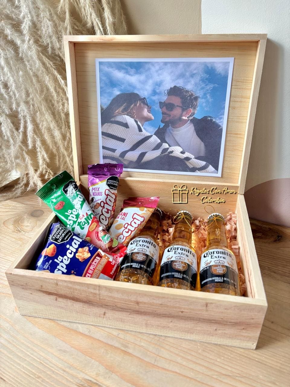 Cofre en madera decorado con moño en cinta de tela, 3 cervezas corinita, 4 paquetes de snack la especial en diferente sabores, foto (que tu nos envías al whatsapp) y tarjeta dedicatoria con el mensaje que nos envies.