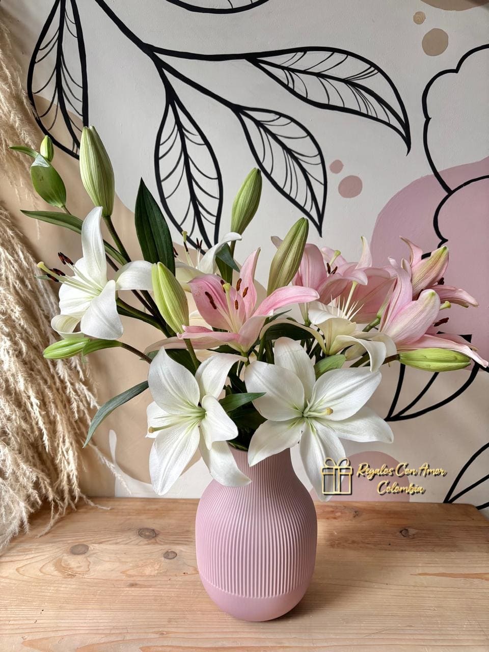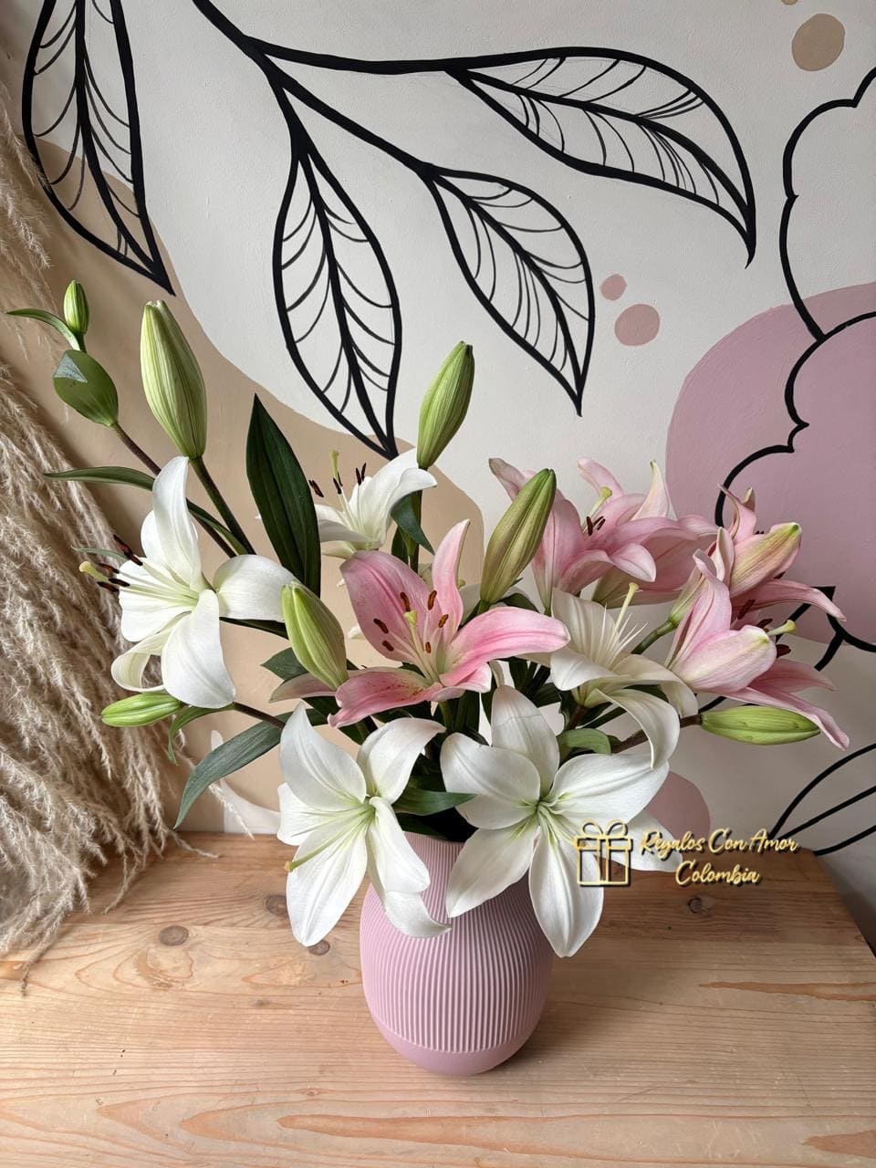 Hermoso jarrón de lujo con 6 varas de lirios y tarjeta dedicatoria con el mensaje que desees.