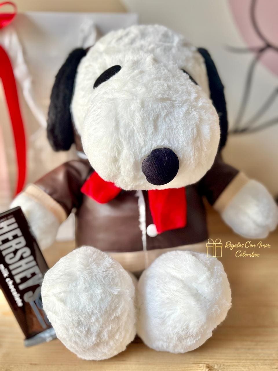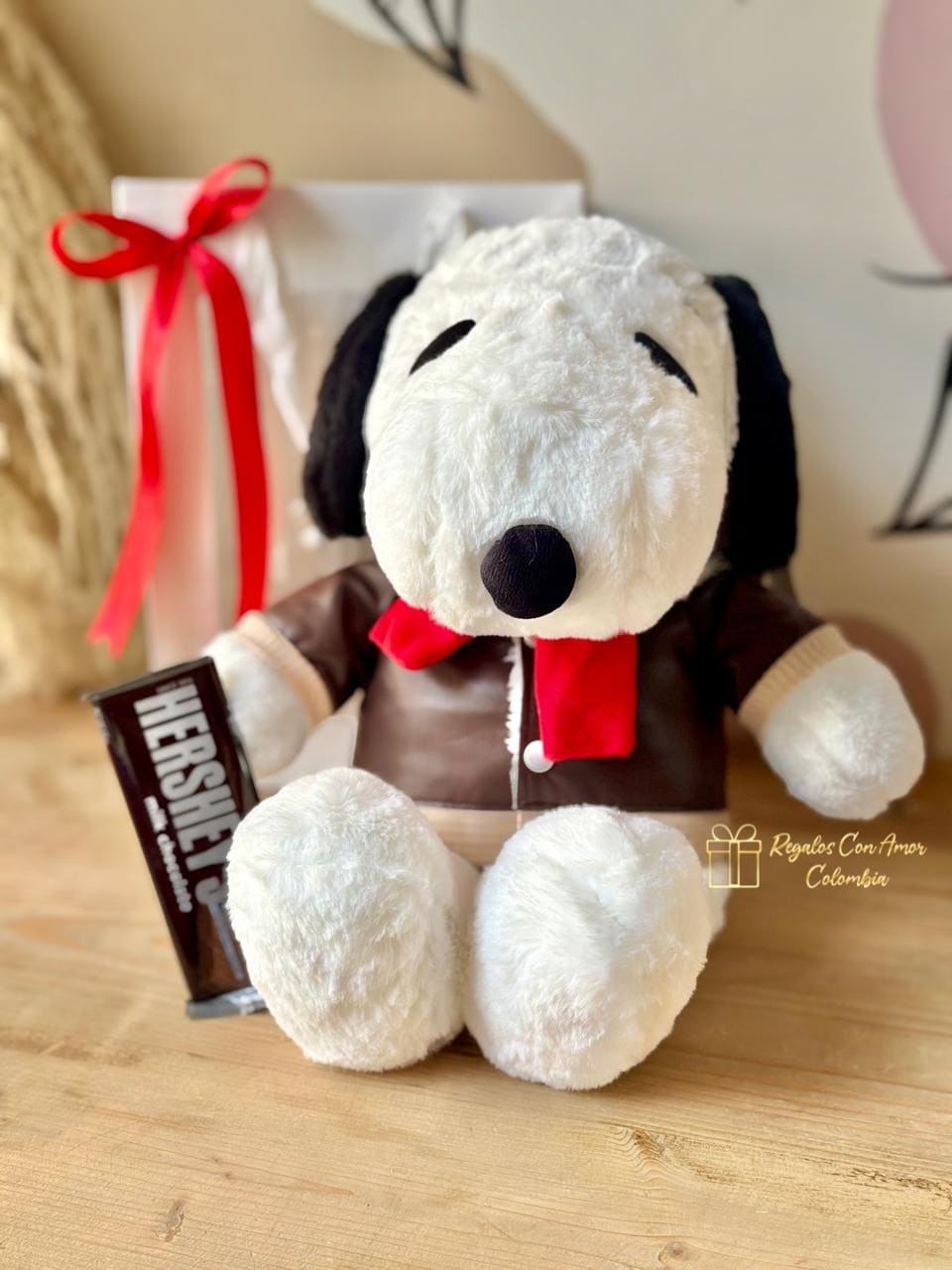 Peluche snoopy 50cm, chocolatina hershey, bolsa con ventana de acetato en donde ira el peluche, con moño en cinta de tela, tarjeta dedicatoria con el mensaje que nos envíes.